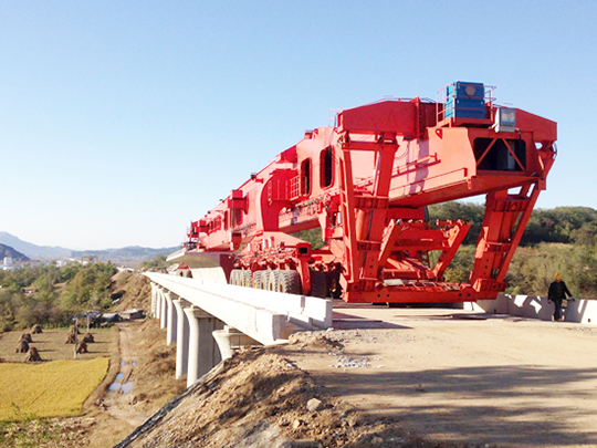 以及生產更新運架產品能架設跨度40M高速鐵路箱梁的:SXJ1000T/40M一跨式架橋機(配套攀爬式運梁車可以實現(xiàn)過隧道零距離架梁)和攀爬式運梁車。并能對現(xiàn)有32M分體式運架設備進行改造,改造后能實現(xiàn)高低位架設跨度40M高速鐵路箱梁(高位改造不能過隧道,把原架橋機改造一跨式,把原運梁車增加2軸。低位改造能過隧道架梁,把原架橋機改造一跨式低位,把原運梁車改成攀爬式運梁車并增加二臺喂梁臺車實現(xiàn)過隧道架梁)。